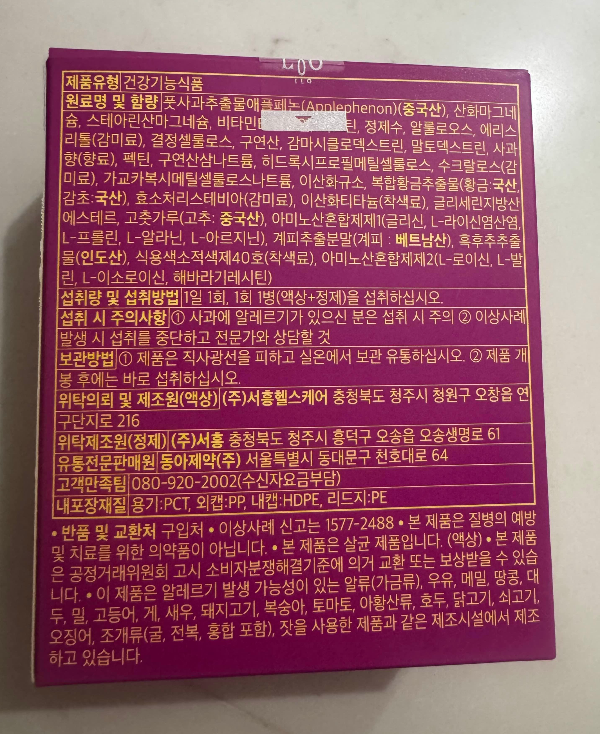 - 정제 2정 : (마그네슘 150mg, 비타민B6 1.5mg, 비오틴 300µg) + 액상 (풋사과애플페논 포함)