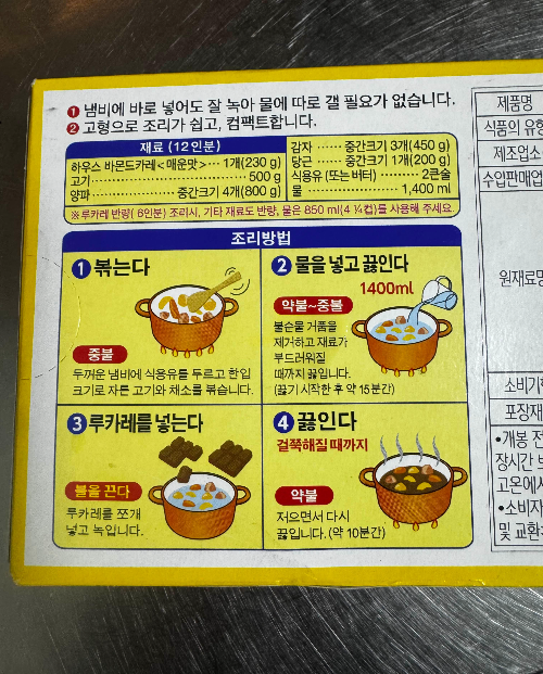 고체 카레 레시피랑 가루로 된 카레랑 다를 건 없음! 하우스 바몬드 카레에 적혀있는 내용은 기본 레시피인 거 같다. 일단 참고하니 음 대충 이런 순서라고 알고 있으니 편했다ㅋㅋ(카레 끓여본 지 오래됨..)