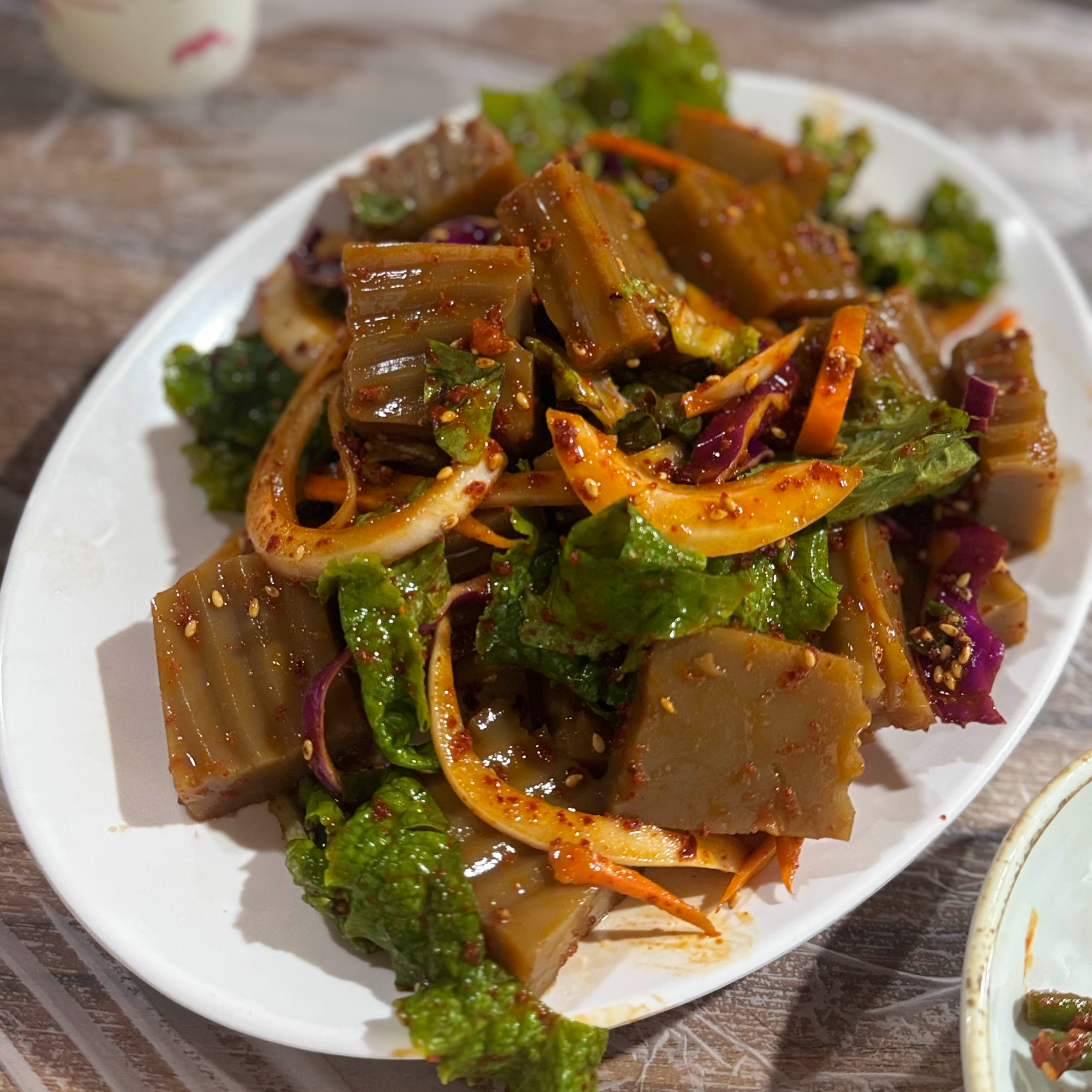 도토리묵 무침! 참기들에 무처진 도토리묵 너무 맛있어요. 에피타이저 같은 느낌으로 비워젔던 도토리묵..!