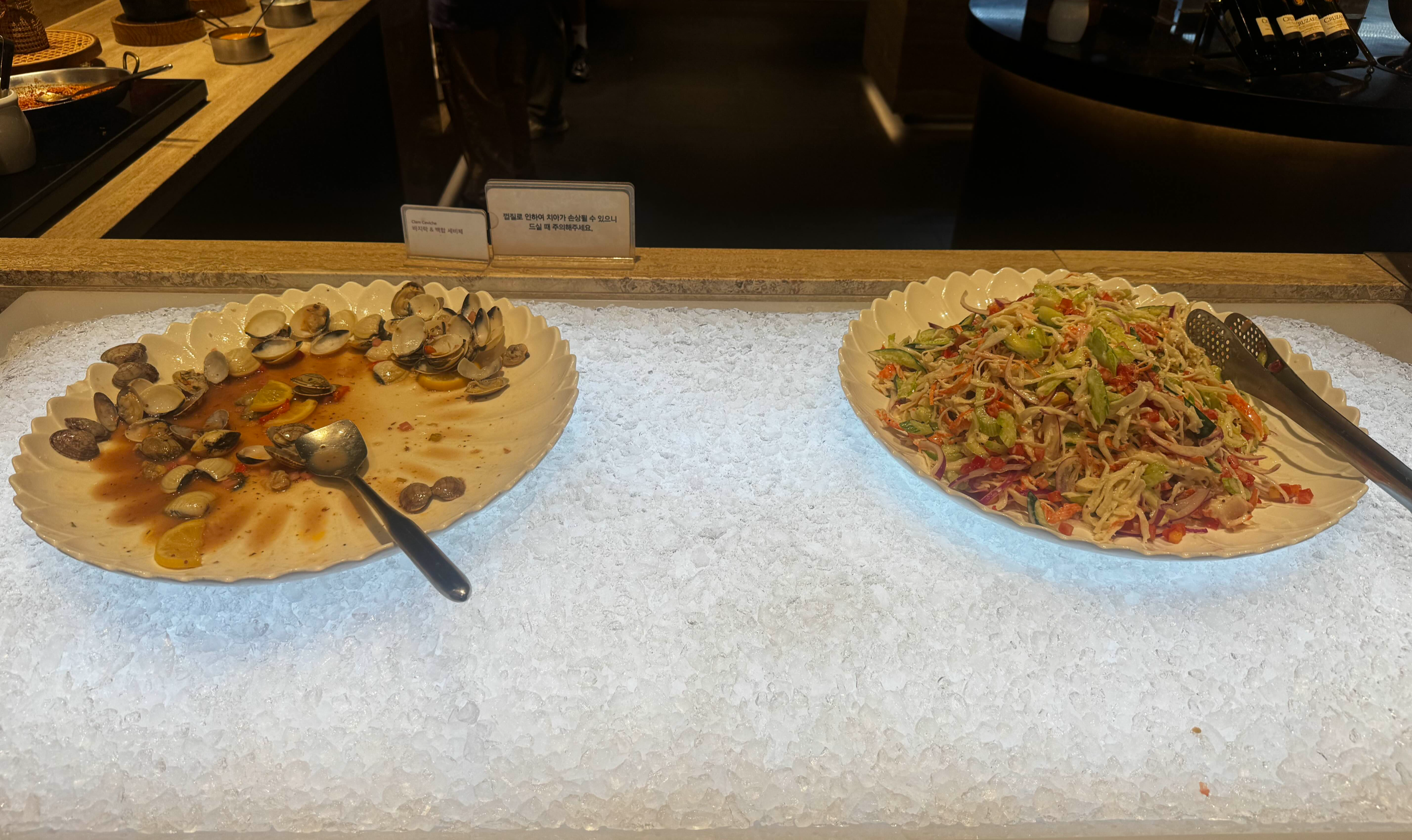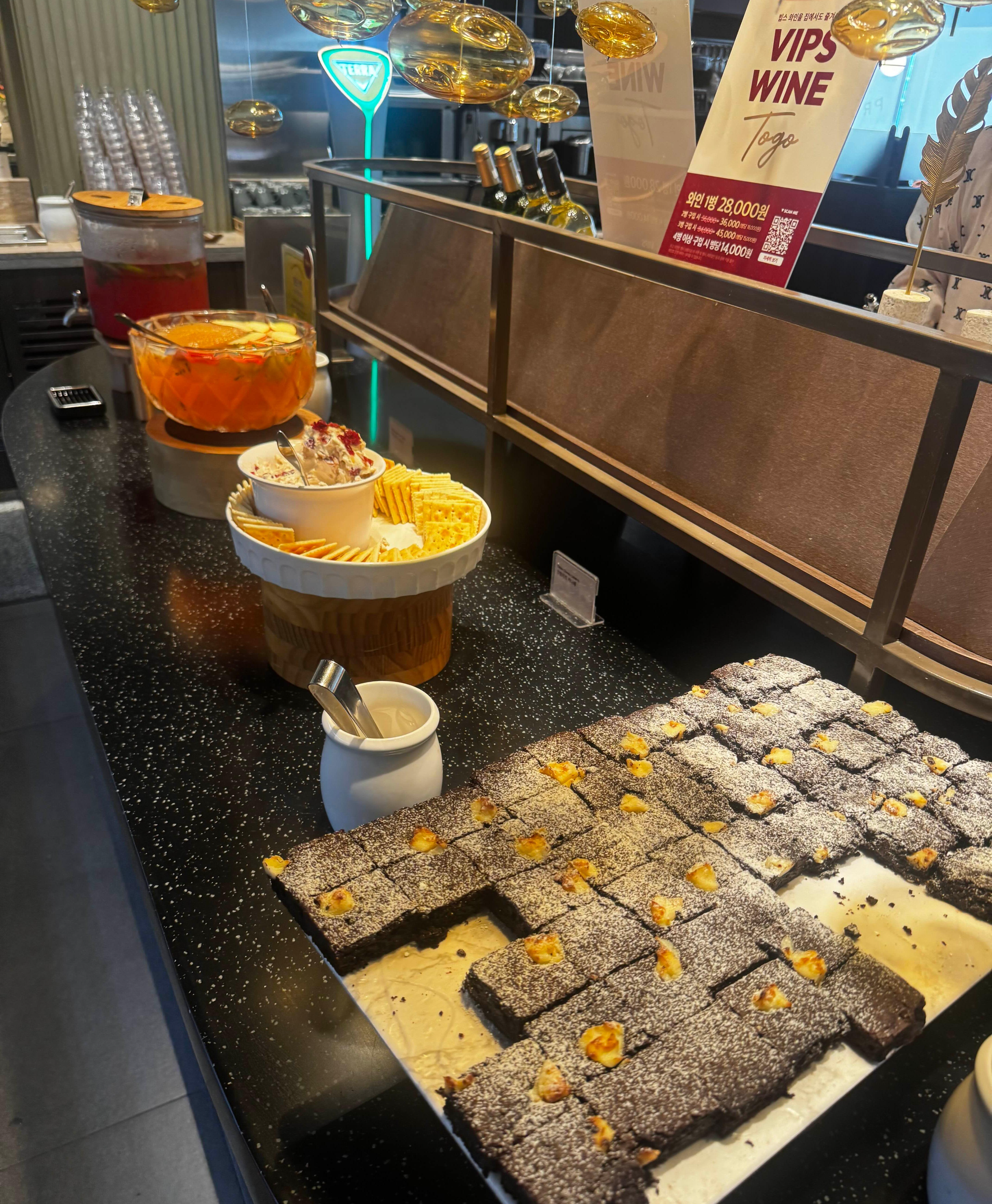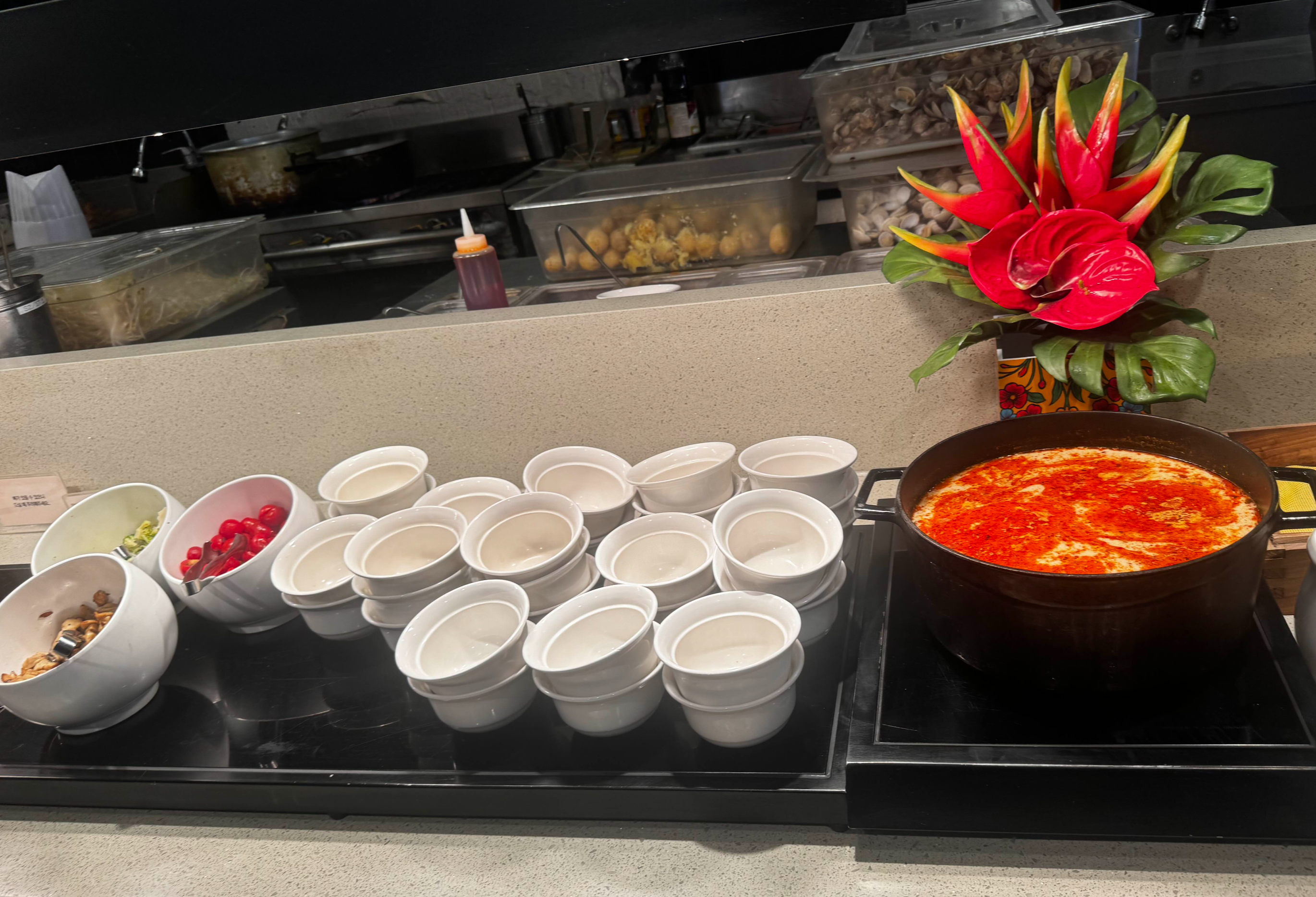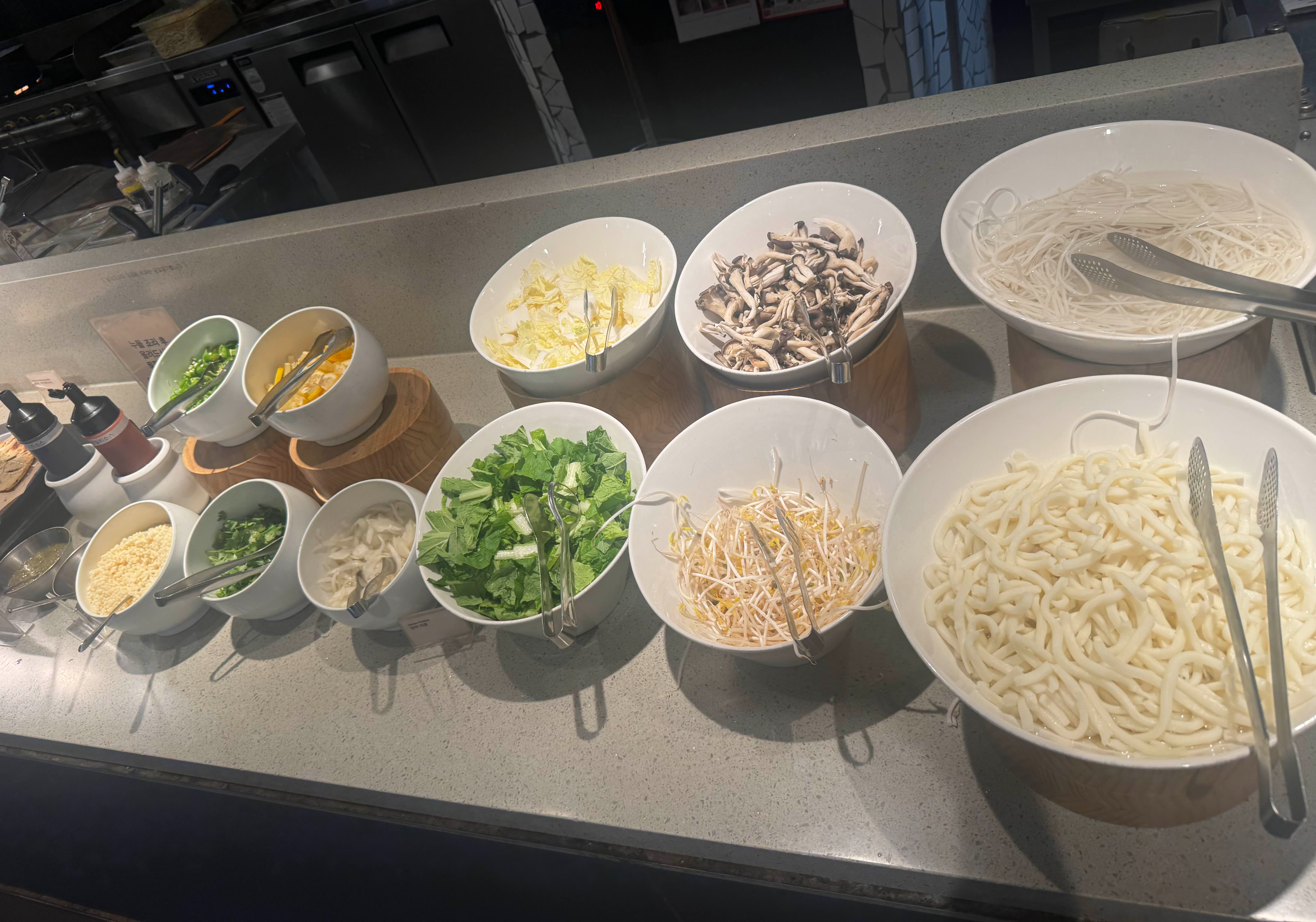 테이블마다 꽉 찼지만 음식 담는 곳에는 엄청 붐비는 편은 아니라 불편함은 없었어요!